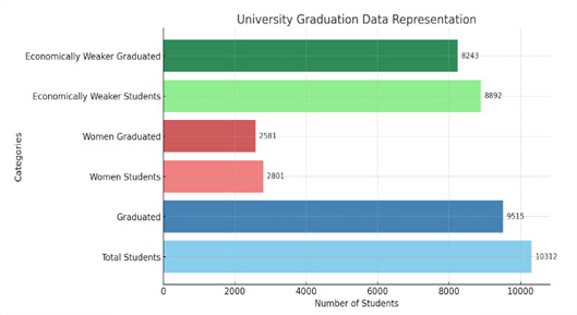 Furthermore, the graduation of 2,581 women out of the 2,801 who appeared underscores our dedication to fostering gender inclusivity and creating equal opportunities in higher education. The chart provides a visual representation of this achievement, showcasing our commitment to accessibility and equitable success in higher education.