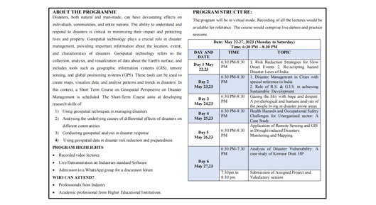 Overview: Participants learned how geospatial technology, including GIS, GPS, and remote sensing, could be applied to disaster management. The course focused on analyzing disaster risks, improving preparedness, and developing response strategies through geospatial data visualization and analysis.