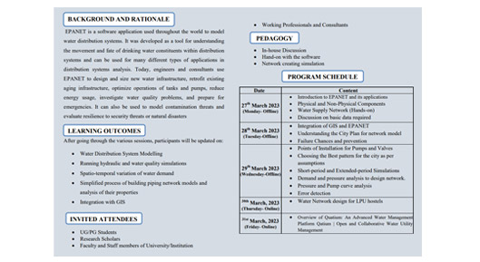 Overview: This course provided hands-on training in EPANET software for modeling water distribution systems. Participants gained skills in designing infrastructure, optimizing water systems, and simulating water quality, with a focus on integrating GIS for spatial analysis.