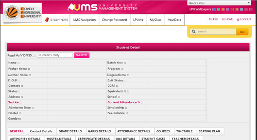 University Management System (UMS): The University Management System (UMS) is Lovely Professional University's (LPU) exclusive platform designed to effectively monitor and track student performance. This centralized database includes a variety of modules, such as attendance monitoring, current grades, current attendance assignment submission, fee payment, and placement-related information. UMS supports all university-wide academic, administrative, student services, and student profiles containing their socioeconomic details, program details, residential details, scholarship information, timetable, teacher details, fee details, and so on. UMS facilitates informed performance monitoring by improving operational efficiency and offering real-time data analytics through the simplification of administrative duties. Through UMS the students, parents, and teachers can track the student’s performance and progress LIVE at any time.