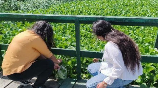 Students collecting natural flora from water bodies to assess ecosystem health,