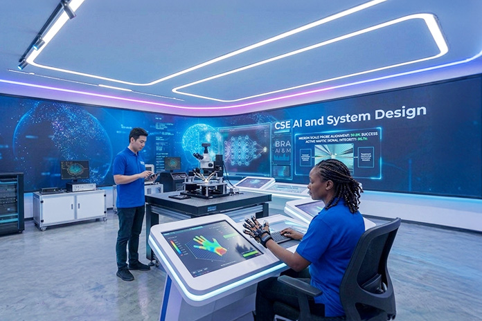 The B.Tech. (CSE – AI and System Design) with Global Tech Immersion programme is designed to bridge the gap between academic learning and industry expectations. It combines core computer science principles with specialised training in Artificial Intelligence and system architecture.