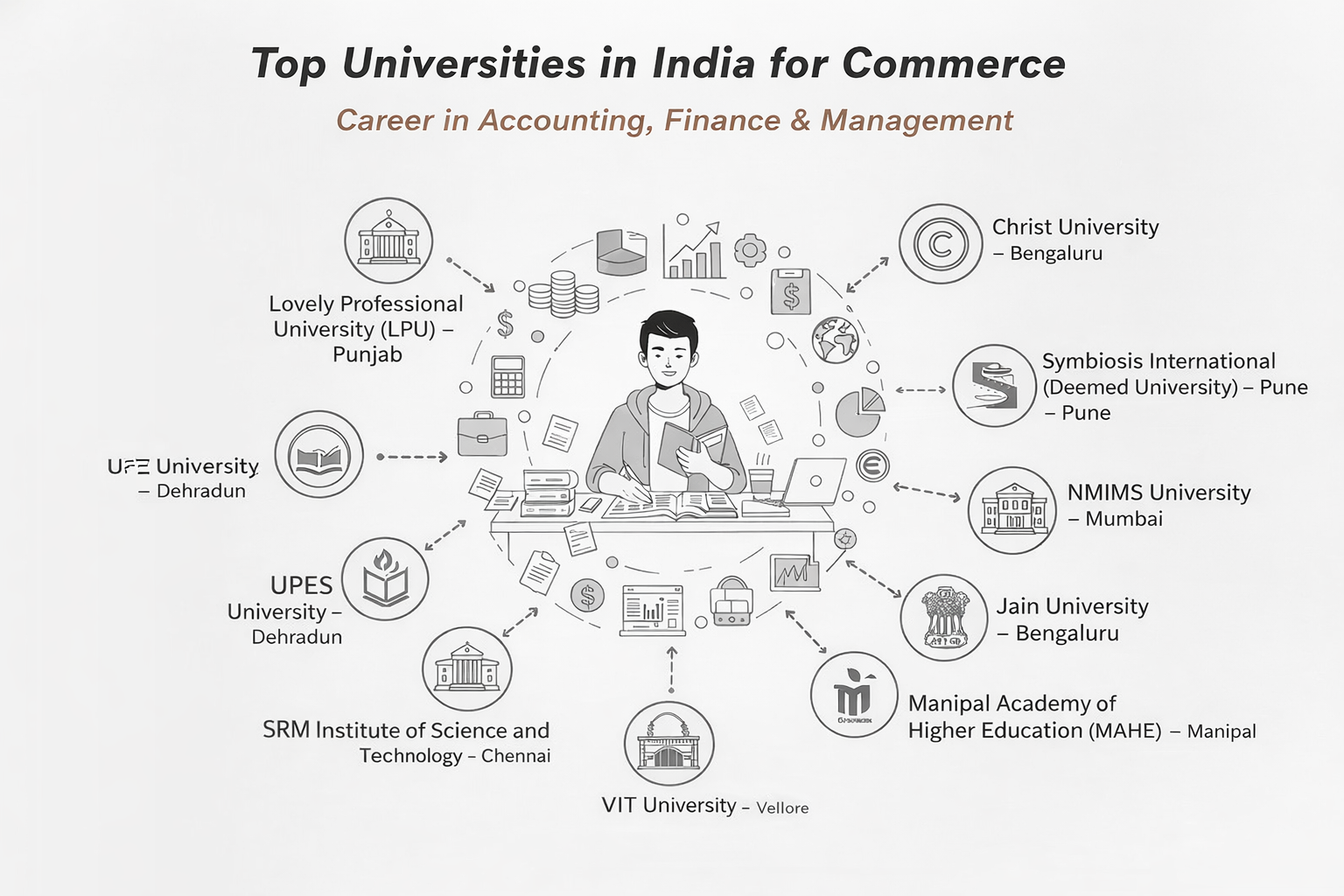Top Universities in India for Commerce, Unlocking Career Success in Business and Finance , including LPU, Amity, SRM, and Manipal, providing industry-aligned B.Com, M.Com, and BBA programs. These universities ensure strong placements, global exposure, and practical learning, preparing students for rewarding careers in finance, accounting, business, and management. Choosing the right commerce university can unlock career growth, professional skills, and corporate opportunities in India and abroad.