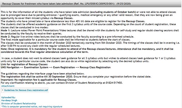 Special Care is taken by the University in monitoring the performance of slow learners. As facing Academic difficulty and failure in certain subjects are the most common reasons for the students to drop out the studies, eventually losing the confidence. Hence, Academic Support in this scenario assists slow learners in achieving their educational goals by providing the academic support through recoup/remedial classes and self-learning material. Student can opt amongst the available support services depending upon their need and time they can invest in for preparation of a particular course.