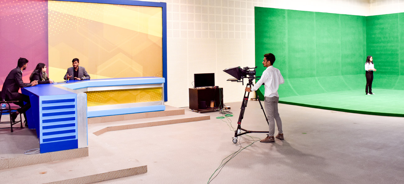 The Television Studio features advanced equipment, professional lighting, and camera setups, providing students with hands-on experience in broadcasting, video production, and multimedia content creation.
