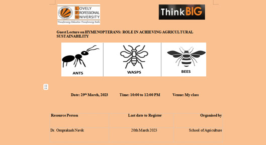 On March 29, 2023, the School of Agriculture at LPU organized an online guest lecture titled “Hymenopterans: Role in Achieving Agricultural Sustainability,” delivered by Dr. Omprakash Navik, a Scientist at the ICAR-National Bureau of Agricultural Insect Resources (NBAII) in Bengaluru. The event attracted more than 100 participants from local/ national community and highlighted the significant contributions of Hymenopterans, a diverse group of insects that includes honeybees, ants, and wasps, to agricultural sustainability.