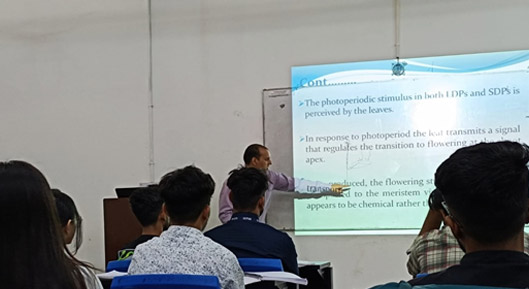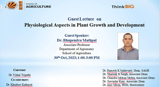 The Department of Horticulture, School of Agriculture, Lovely Professional University, successfully organized a guest lecture on the physiological aspects of plant growth and development on 30th October 2023. The lecture, delivered by Dr. Bhupendra Mathpal, Associate Professor in the Department of Agronomy, was held from 1:00 to 3:00 p.m. and saw the participation of 18 students. The primary objectives of the event were to provide a detailed study of the physiological aspects of flowering, fruit set, fruit development, and ripening in vegetable crops, as well as to explore the physiological processes involved in dormancy and germination of vegetable seeds. Through this insightful session, students gained a deeper understanding of the critical factors influencing plant growth and the developmental stages of vegetable crops.