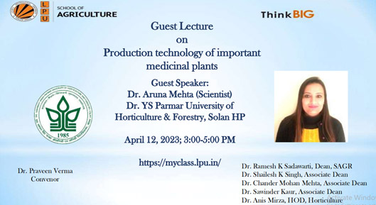 On 12th April 2023, the School of Agriculture organized a guest lecture on the topic "Production Technology of Important Medicinal Plants". The event was conducted online in rooms 56-509 and 56-705 and was attended by 92 participants. The lecture was delivered by Dr. Aruna Mehta, a Scientist at CSIR-Institute of Himalayan Bioresource Technology, Palampur. The primary objective of the event was to raise awareness among students about the production technology of significant medicinal plants. Through this session, students gained valuable insights into the cultivation practices and techniques required for the successful production of medicinal plants, which play a vital role in the field of natural health and wellness. The lecture was a key opportunity for students to enhance their knowledge in this specialized area of agriculture.