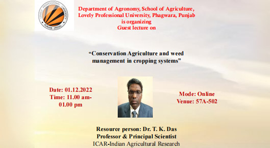 The School of Agriculture, Department of Agronomy, organized an online guest lecture on "Conservation Agriculture and Weed Management in Cropping Systems" on 1st December 2022 via the My Class Platform. The lecture was delivered by Dr. T. K. Das, Professor and Principal Scientist at the Division of Agronomy, ICAR-Indian Agricultural Research Institute, New Delhi. Dr. Das, with vast experience in weed science, including a tenure as Associate Professor at Alemaya University, Ethiopia, under a World Bank-funded project, shared valuable insights with 146 participants. The lecture covered fundamental concepts as well as recent approaches in weed management across various field crops
