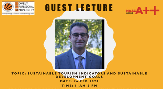 The Sustainable Tourism Indicators and Sustainable Development Goals event, held on February 26, 2024, at Lovely Professional University (LPU), Block 15, was organized by the School of Hotel Management and Tourism, LPU in an offline mode. Featuring Assistant Professor Siamak Seyfi from the University of Oulu, Finland, as the guest speaker, the event attracted 80 participants. LPU’s initiative educated local and national communities on sustainable tourism indicators, emphasizing their role in tracking progress toward the UN’s Sustainable Development Goals. This outreach program empowered stakeholders to make informed decisions, promoting balanced economic, social, and environmental outcomes in tourism management.