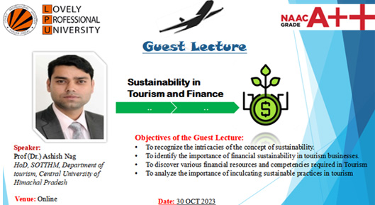 LPU observes World Sustainability Day every year on the last Wednesday of October, emphasizing the protection of land, flora, and fauna through sustainable practices. On October 30, 2023, the School of Hotel Management and Tourism-II hosted an online guest lecture by Prof. (Dr.) Ashish Nag on “Sustainability in Tourism and Finance.” He explained how financial tools such as Socially Responsible Investing (SRI) and bootstrapping support sustainable tourism, while stressing their role in preserving native ecosystems and promoting environmental stewardship.