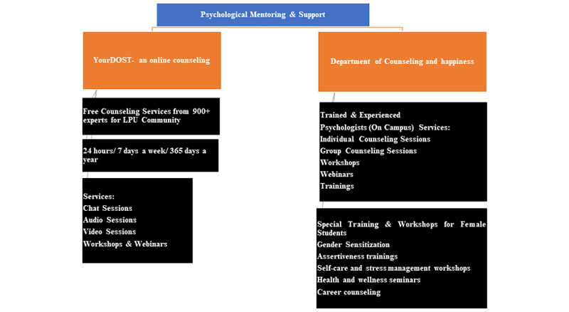 The mentoring system established by LPU plays a crucial role in the holistic development of students. The mentorship aims at providing guidance and support throughout their academic journey at the university. Students are assisted through multifaceted mentoring support systems, including academic mentoring by academic mentors, psychological support by the Department of Counseling & Happiness and YourDOST, and career counselling by the Centre for Professional Enhancement (refer Exhibit 1)