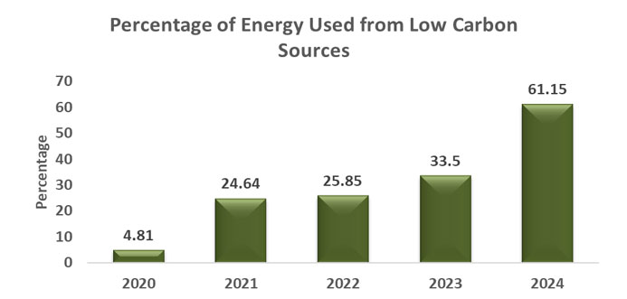 The University’s commitment to guidelines contributes to the United Nations’ sustainable development goals, and it’s worth noting that in 2018, the University erected a 1.1 MW rooftop solar PV plant. Currently, 7.5 MW of Solar power plant is installed in the university. With these initiatives, Not only has the university lowered the total power use from the conventional resources, but it has also boosted the university’s renewable generation. From the graph below it was observed that the percentage of Energy Produced from low carbon resources with respect to the total energy production is increasing from the previous years. The percentage of energy produced from low-carbon resources has shown a significant upward trend over the past four years, increasing from 4.81% in 2020 to 33.5% in 2023. This highlights a strong movement towards cleaner energy production and a reduction in reliance on high-carbon energy sources.